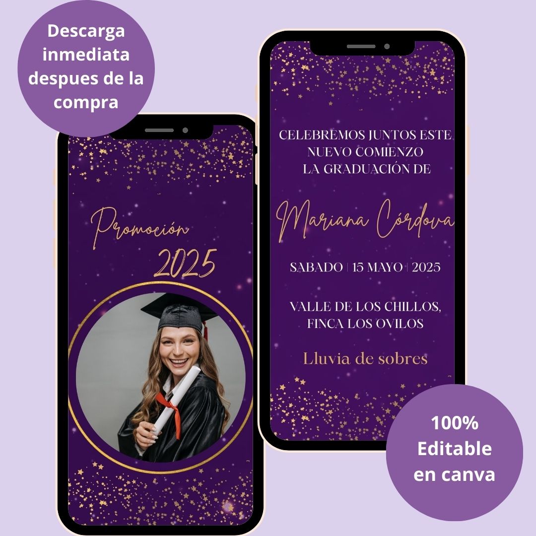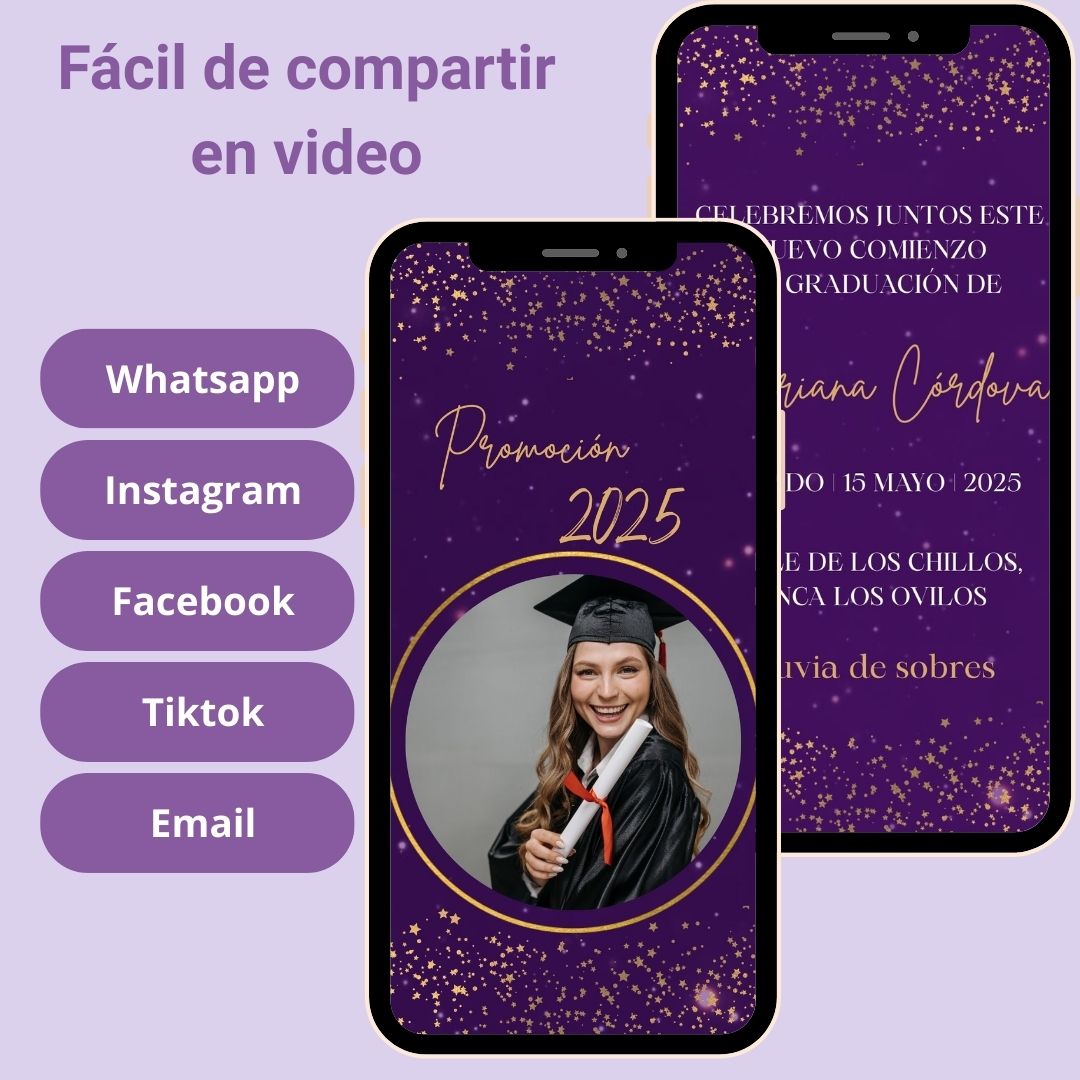 Celebra ese gran logro con estilo moderno y digital. Esta invitación en video editable es perfecta para compartir por WhatsApp, redes sociales o email. ¡Haz que ese momento especial empiece con una presentación inolvidable!